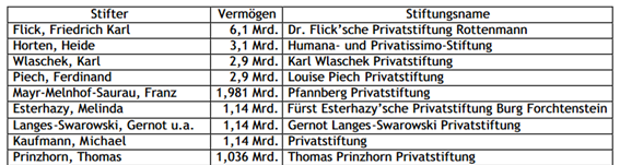 Die letzte öffentlich verfügbare Liste der Vermögen von Privatstiftungen stammt etwa aus dem Jahr 2004 – neuere Angaben zum Vermögen der einzelnen Privatstiftungen gibt es nicht. In dieser Liste werden die folgenden Privatstiftungen mit einem Vermögen von mehr als 1 Mrd. Euro geführt:
