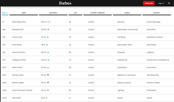 Die neueste Forbes-Liste, die am 4. Oktober 2023 veröffentlicht wurde, enthält elf Österreicher (nur Männer) als Dollar-Milliardäre:
