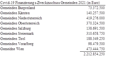 „(9) Der Bund gewährt den Gemeinden als pauschale Abgeltung für die Covid-19 bedingten Einnahmenausfälle aus den Ertragsanteilen der gemeinschaftlichen Bundesabgaben sowie der Kommunalsteuer im Jahr 2021, einen Zweckzuschuss von 250 Euro pro hauptgemeldeter Einwohnerin oder hauptgemeldetem Einwohner (Wohnbevölkerung gem. § 10 Abs. 7). Die Summe von 2.212.854.250 Euro wird gemäß Anlage A im folgenden Verhältnis auf die Gemeinden des Bundeslandes verteilt: