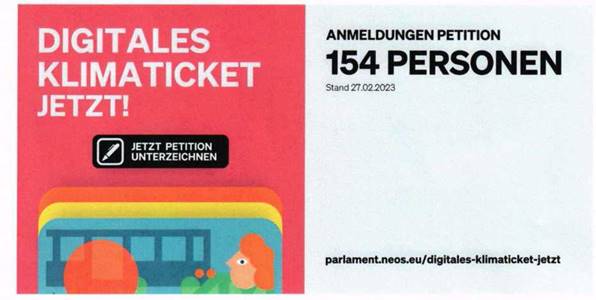 Sehr geehrte Frau Bundesministerin Gewessler, Herr Staatssekretär für Digitalisierung Tursky, werte Abgeordneten zum Österreichischen Nationalrat. Wir ersuchen Sie für über 170.000 Nutzer:innen des Klimatickets endlich ein digitales Ticket umzusetzen.