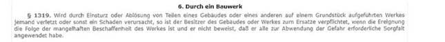 Wird durch Einsturz oder Ablösung von Teilen eines Gebäudes oder eines anderen auf einem Grundstück aufgeführten Werkes jemand verletzt oder sonst ein Schaden verursacht, so ist der Besitzer des Gebäudes oder Werkes zum Ersatz verpflichtet, wenn die Ereignung die Folge der mangelhaften Beschaffenheit des Werkes ist und er nicht beweist, dass er alle zur Abwendung der Gefahr erforderliche Sorgfalt angewendet habe. "Der Baum ist kein Werk im Sinne dieser Bestimmung."