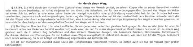 Abs 2: Ein Weg im Sinn des Abs. 1 ist eine Landfläche, die von jedermann unter den gleichen Bedingungen für den Verkehr jeder Art oder für bestimmte Arten des Verkehres benützt werden darf, auch wenn sie nur für einen eingeschränkten Benutzerkreis bestimmt ist; zu einem Weg gehören auch die in seinem Zug befindlichen und dem Verkehr dienenden Anlagen, wie besonders Brücken, Stützmauern, Futtermauern, Durchlässe, Gräben und Pflanzungen. Ob der Zustand eines Weges mangelhaft ist, richtet sich danach, was nach der Art des Weges, besonders nach seiner Widmung, für seine Anlage und Betreuung angemessen und zumutbar ist. „Der Wegehalter ist nicht für die von fremdem Grundstück ausgehenden Baumgefahren verantwortlich.“ oder „Auch für Baumgefahren von fremden Grundstücken findet der Sorgfaltsmaßstab des Abs 1 mit der Maßgabe des § 1319b Anwendung, sofern sich aus öffentlich-rechtlichen Gesetzen keine spezielleren Regelungen ergeben.“