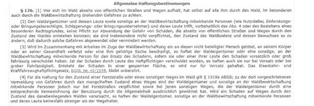 Abs 1: Wer sich im Wald abseits von öffentlichen Straßen und Wegen aufhält, hat selbst auf alle ihm durch den Wald, im Besonderen auch durch die Waldbewirtschaftung drohenden Gefahren zu achten. „Er handelt insofern allein auf seine eigene Gefahr.“