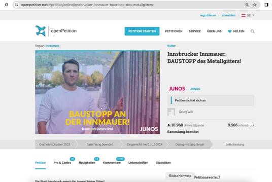 Laut WRG, Wasserrechtsgesetz 1959, § 4 Abs.2, dient das öffentliche Wassergut unter Bedachtnahme auf den Gemeingebrauch (§ 8) lit.e auch der Erholung der Bevölkerung. Und genau dieser Erholungsraum wird gerade durch die geplante Anbringung eines Geländers auf der Innmauer im Bereich der so genannten Franz-Gschnitzer-Promenade in Innsbruck, für immer zerstört. Das müssen wir verhindern.