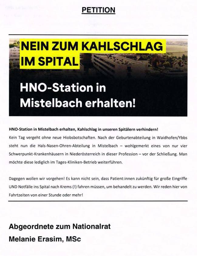 „HNO-Station in Mistelbach erhalten, Kahlschlag in unseren Spitälern verhindern“