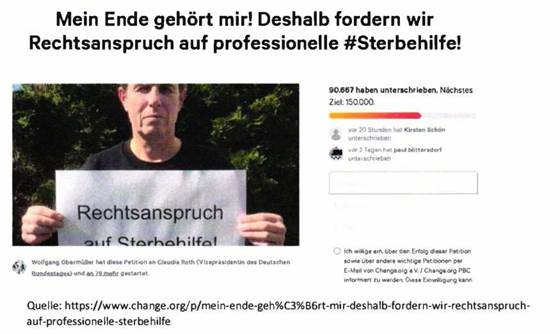 Die Petition stützt sich außerdem auf das Urteil des Europäischen Gerichtshof für Menschenrechte[2] und das Urteil des Deutschen Bundesverfassungsgerichts[3] und auf die dort bereits begonnene praktische Umsetzung, sowie auf die Liberalisierung oder sogar Zulassung von Sterbehilfe in weiteren (europäischen) Ländern. Die Petition bezieht sich auf die Empfehlungen der Bioethikkommission des Bundeskanzleramts („Sterben in Würde", 2015), die eine Reform der Sterbehilferegelungen empfahl. Als Umsetzungsmöglichkeit verweist die Petition auf das niederländische und das Schweizer Modell der Sterbehilfe.