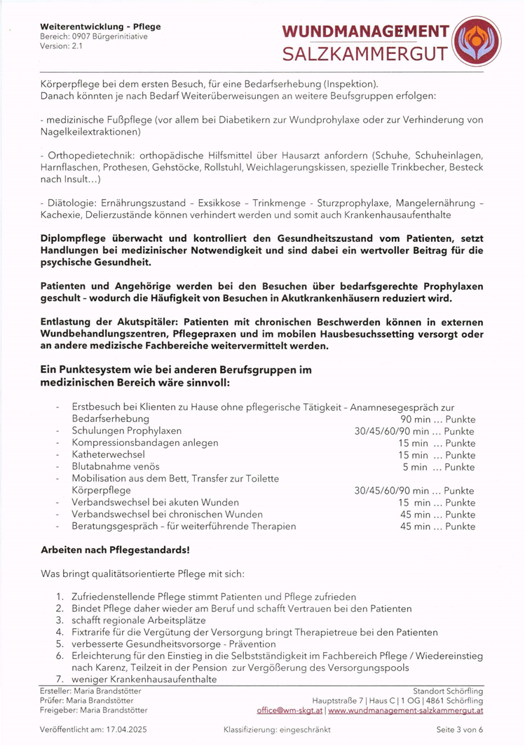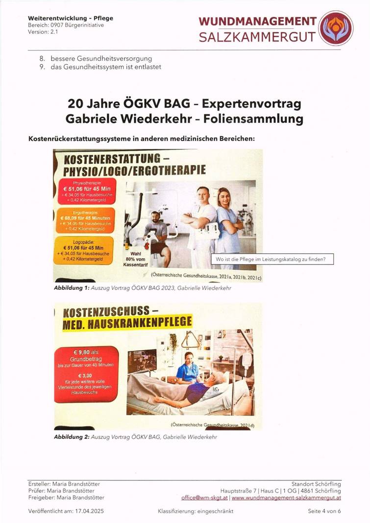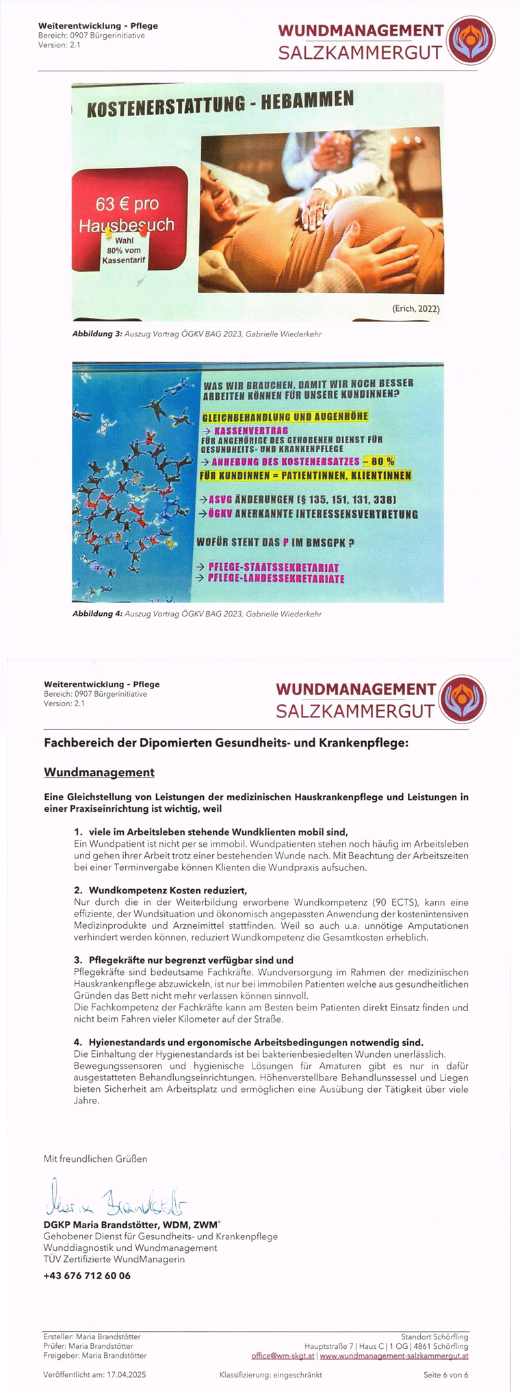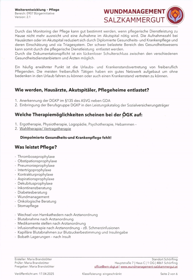 die Gruppe der diplomierten Gesundheits- und Krankenpflege im allgemeinen Sozialversicherungsgesetz §135 ASVG "Ärztliche Hilfe" als Berufsgruppe zur Krankenbehandlung anzuerkennen. Weiters wird ersucht, pflegerische Maßnahmen in den Leistungskatalog der Sozialversicherungsträger aufzunehmen. Darunter sind folgende Punkte zu nennen: Wundbehandlung - Wundmanagement - Stomaversorgung - lnfusionstherapie - Wechsel von Harnkathedern - Blutabnahme als Einleitung zur Diagnostik - Diabetesberatung - onkologische Beratung - Dekubitus Prophylaxe - Pneumonie Prophylaxe - Intertrigo Prophylaxe - Kontrakturprophylaxe - Obstipationsprophylaxe - Apsirationsprophylaxe - Bobath Lagerungen - manuelle Kompressionstherapie - medizinische Hautpflege Schulung von pflegenden Angehörigen