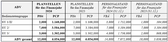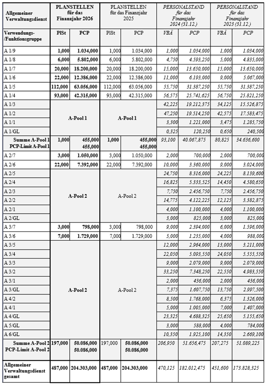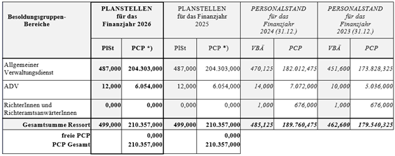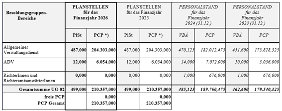 Von den Planstellen für das Finanzjahr 2026 dürfen 499 mit Beamtinnen und Beamten besetzt sein (§ 44 Abs. 4 Z 3 BHG 2013).