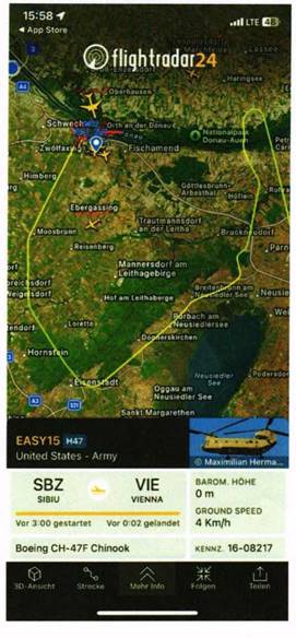 Am 7. November 2024 landete laut Flightradar24 ein Hubschrauber der amerikanischen Streitkräfte vom Typ Boeing H47 „Chinook“ mit der Kennung EASY15 und dem Kennzeichen 16-08217 auf dem Flughafen Schwechat.
