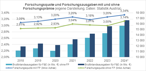 Abbildung 1: Forschungsquote und Forschungsausgaben (rechte Achse) mit und ohne Forschungsprämie (eigene Darstellung; Daten: Statistik Austria; Y-Achsen verkürzt dargestellt.)