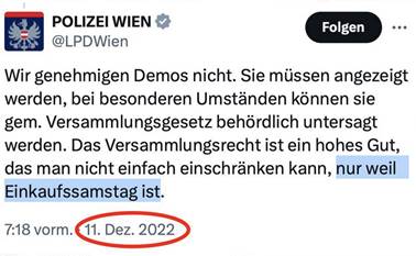 Interessant sind in diesem Zusammenhang im Internet kursierende Screenshots von Veröffentlichungen desselben Accounts vom Dezember 2022, wo hinsichtlich der Untersagung von Demonstrationen völlig gegenteilig argumentiert wurde: