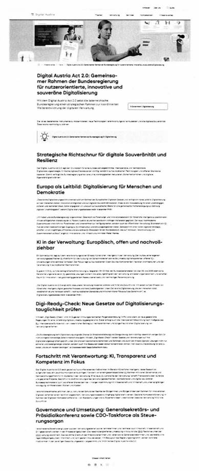Auch jetzt, fast zwei Monate später findet man zwar den Digital Austria Act 2023 aus der türkis-grünen Vorgängerregierung mit 117 konkreten Maßnahmen und 36 Digitalisierungsgrundsätzen[2], allein einen Digital Austria Act 2.0 kann man nicht finden. Auf der Website zum Digital Austria Act ist zwar das Dokument aus 2023 verlinkt. Zum Digital Austria Act 2.0 gibt es hingegen nur eine News-Website: