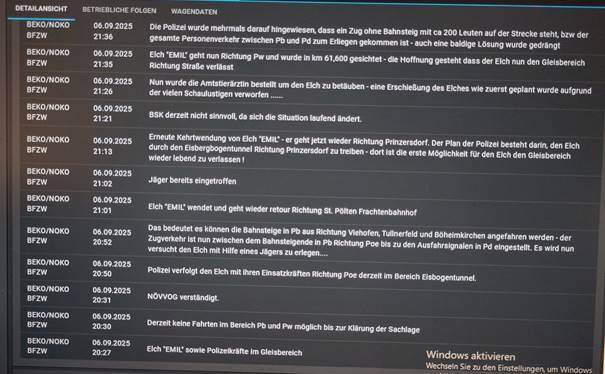 Elch „Emil“, der seit Mitte August 2025 von Tschechien kommend den Nordosten Österreichs erkundet, sorgte am Abend des 6. September 2025 für einen mehrstündigen Stillstand des Schienenverkehrs im Bereich von St. Pölten.