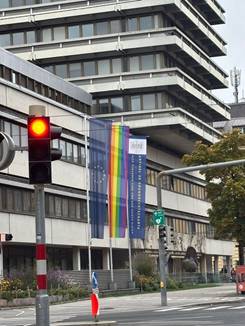 dieser Anfrage abgelichtet Regenbogen-fahne vor dem Landesgericht