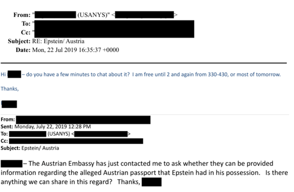 So findet sich in den jüngsten „Epstein-Files“ ein Mailverkehr unter Beteiligung der US-Strafverfolgungsbehörden, aus dem hervorgeht, dass die österreichische Botschaft bereits im Jahr 2019 um Informationen zum damals vermeintlichen österreichischen Pass angefragt hat[2]: