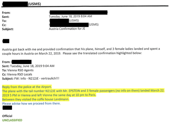 In den neuesten Epstein-Files findet sich dazu ein Mailverkehr zwischen einem US-Beamten und der US-Bundesstrafverfolgungsbehörde, in dem der US-Beamte offenbar nach Rücksprache mit Angehörigen der Polizei Schwechat Informationen über Jeffrey Epstein, darunter Epsteins Flugzeugnummer, seine Reisebegleitung und wo er sich in Wien aufgehalten hat, weitergibt. Bei der Polizei Schwechat wurde dazu mit einem gewissen „Poldi“ Rücksprache gehalten.[6]