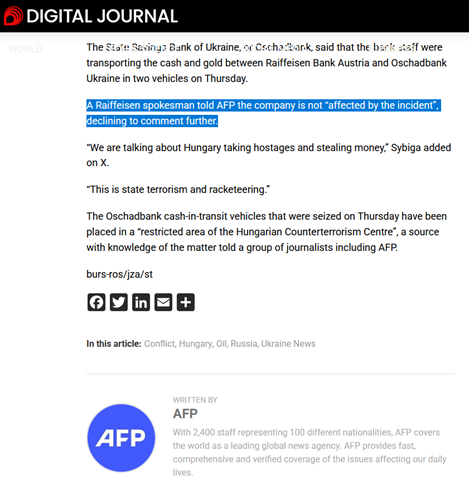 Besonders brisant erscheint dabei der Umstand, dass der Transport laut übereinstimmenden Angaben ukrainischer Stellen im Rahmen einer Übereinkunft mit der Raiffeisen Bank International (RBI) erfolgt sein soll. Nach anfänglichen Berichten soll die Bank eine Beteiligung zunächst bestritten haben, während gleichzeitig Vertreter der ukrainischen Oschadbank, der ukrainischen Nationalbank sowie das ukrainische Außenministerium die RBI ausdrücklich als Vertragspartner des Transportes bezeichneten.[5]