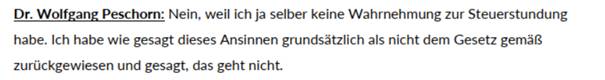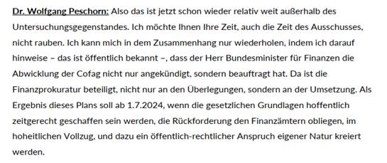 Bemerkenswert ist in diesem Zusammenhang auch, dass der Leiter der Finanzprokuratur, Wolfgang Peschorn, zu diesen Steuerstundungen als Auskunftsperson im COFAG-Untersuchungsausschuss wie folgt ausführte: