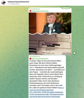 Der neonazistische Telegram-Kanal „Radio Deutschösterreich“ veröffentlichte am 27. Oktober 2024 einen angeblichen Zahlschein von Walter Rosenkranz an die mittlerweile verstorbene rechtsextreme Aktivistin und Publizistin Lisbeth Grolitsch. Die Überweisung galt mutmaßlich der von Lisbeth Grolitsch geführten Organisation „Deutsche Kulturgemeinschaft Österreich“[1], die als Schaltstelle des österreichischen Neonazismus und Rechtsextremismus zu gelten hat und deren Kassier zeitweise Franz Radl war[2]. Der Betreiber des Kanals fragt sich in dem Posting, ob Rosenkranz der Sache treu bleibt und „