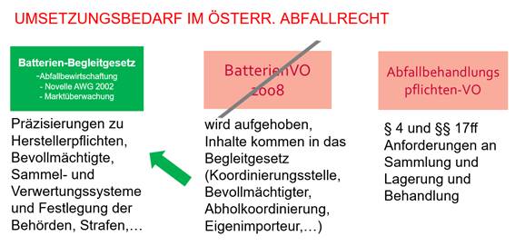 Ein weiterer Bereich ist die Abgleichung von Pflichten zur Lagerung, Sammlung und Behandlung von Altbatterien, die schon bisher in der österreichischen Abfallbehandlungspflichtenverordnung geregelt waren und die im Rahmen einer Novelle dieser Verordnung zusammengeführt werden sollen.