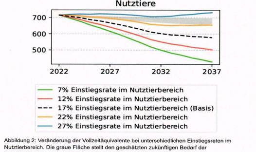 Die obige Grafik veranschaulicht die Entwicklungen bei unterschiedlichen angenommenen Einstiegsraten im Nutztierbereich. Sie zeigt, dass mindestens eine Einstiegsrate von 22 Prozent benötigt wird, um den Bedarf zu decken.