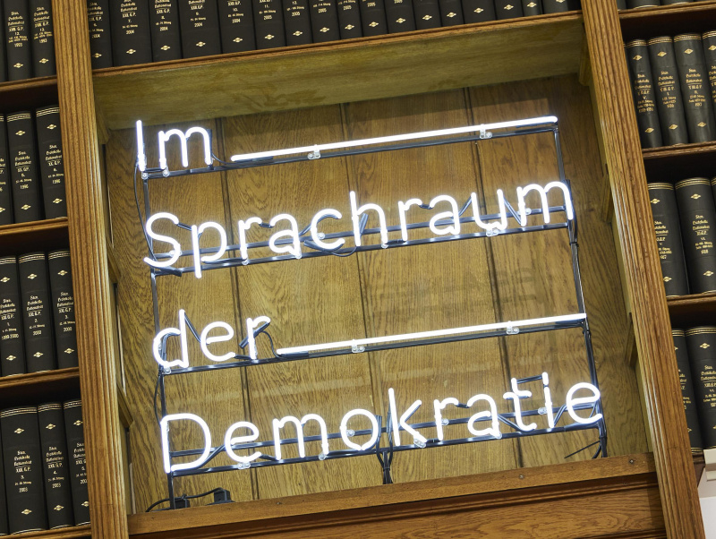 Sprache ist politisch: Die Ausstellung erkundet anhand von exemplarischen Beispielen die Rolle von Sprache und Schrift in der parlamentarischen Demokratie – von der hitzigen Debatte im Plenum über das Stenographische Protokoll und den kundgemachten Gesetzestext bis hin zum "lesbaren" Haus. In acht Kapiteln werden die sprachlichen Sphären des Parlaments in ihrer gesamten geregelten Bandbreite dargestellt. Ausgewählte Exponate der Parlamentsbibliothek und des Archivs geben Einblick in die reichhaltigen Bestände des Hauses und sollen das Bewusstsein für die politische Wirksamkeit des gesprochenen und gedruckten Worts schärfen.