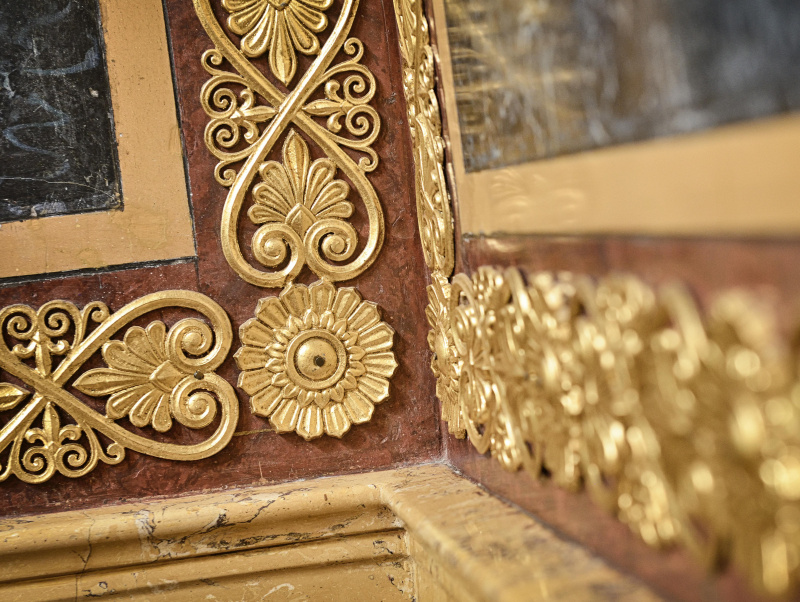 Die Ausstattung der Prunkräume, die an der Frontseite des Hauses liegen, zeigt noch heute eine Vielfalt von wertvollen Materialien und Techniken. Je nach Raum und Funktion setzte Hansen sie in unterschiedlicher Kombination und Farbe ein.