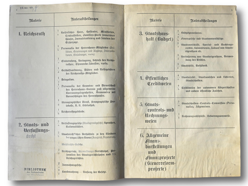 Vor der Erfindung elektronischer Datenbanken sahen sich Archivarinnen und Archivare immer wieder vor dieselbe Frage gestellt: Wie können Dokumente in der täglichen Flut von Gesetzesvorlagen, Anträgen, Anfragen, Akten und Briefen schnell und treffsicher aufgefunden werden? Bereits im 19. Jahrhundert entwickelten die Bediensteten des Parlamentsarchivs daher ein sogenanntes "Einordnungs-Schema".