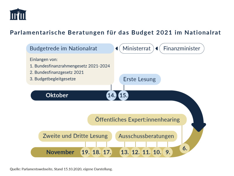 Im Unterschied zu den sonstigen Gesetzesbeschlüssen sehen die Bundesverfassung und das Unionsrecht (insbesondere das Europäische Semester) sehr genaue Regeln für die Vorbereitung, Beschlussfassung und Kontrolle des Budgets vor. Der gesamte Budgetprozess ist in das sogenannte Europäische Semester eingebunden. Das ist die Koordinierung und Überwachung der Haushaltspolitik der EU-Mitgliedstaaten.