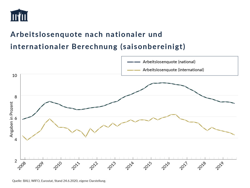 Die Anzahl der Arbeitslosen in Österreich nach internationaler Berechnung ist bis April 2020 mit 227.700 Personen nur leicht gestiegen (+12.600 Personen im Vergleich zum April 2019). Die Anzahl der Erwerbstätigen lag im April 2020 jedoch um 163.900 Personen unter dem Vorjahreswert. Es zeigt sich hier ein deutlicher Unterschied bei der Anwendung der internationalen Definition von Arbeitslosigkeit, da diese die aktive Suche nach Arbeit und die Bereitschaft, eine Arbeitsstelle innerhalb von zwei Wochen anzutreten, voraussetzt. Nicht erwerbstätige Personen, die zwar grundsätzlich gerne arbeiten würden aber nicht aktiv nach Arbeit suchen oder nicht kurzfristig mit einer Erwerbstätigkeit beginnen können, werden zur „stillen Reserve“ gezählt. Diese ist in der aktuellen Krise deutlich angestiegen und lag im April 2020 mit 221.000 Personen um 119.100 Personen über dem Vorjahresvergleichswert.
