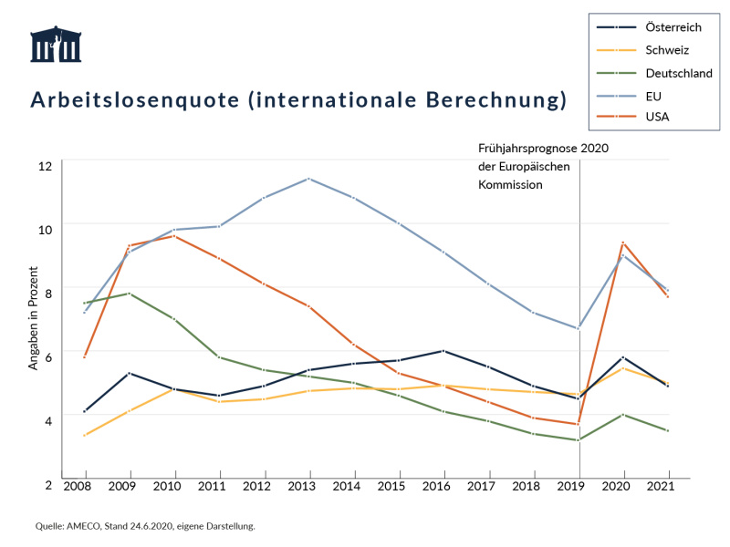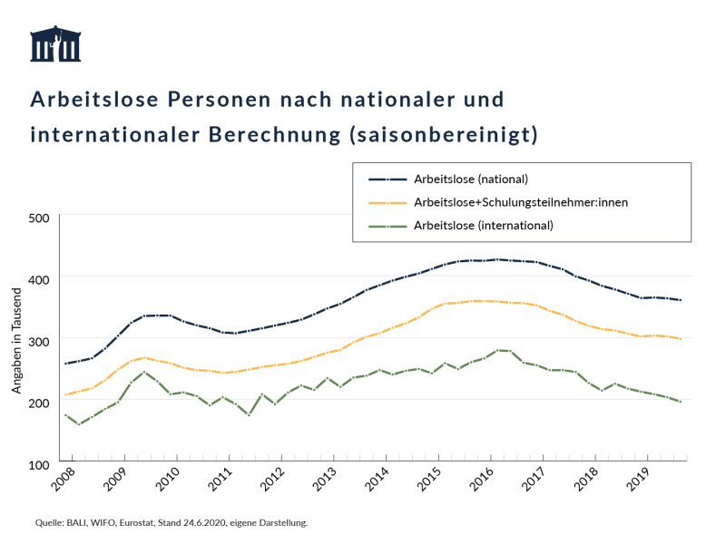 Das AMS veröffentlicht in sogenannten Spezialthemen zum Arbeitsmarkt auch den Stand der vorgemerkten Arbeitslosen im Jahr 2020 im Vergleich zum Jahr 2019. Die Anzahl der vorgemerkten Arbeitslosen ist vom 15. März 2020 bis zum 13. April 2020 um rund 223.105 Personen auf einen historischen Höchststand von 533.621 Personen gestiegen. Nach ersten Lockerungen der Einschränkungen kam es wieder zu einem, teilweise saisonbedingten, Rückgang auf 473.300 vorgemerkte Arbeitslose Ende Mai 2020. Dies bedeutet auch Ende Mai noch 194.352 zusätzliche Arbeitslose im Vergleich zum Mai 2019. Ein Teil des Anstiegs ist auf die um 20.268 Personen geringere Anzahl an SchulungsteilnehmerInnen zurückzuführen. Die Anzahl der arbeitslosen Personen und SchulungsteilnehmerInnen betrug mit Ende Mai 517.221 Personen (+174.084 im Vergleich zum Jahr 2019).