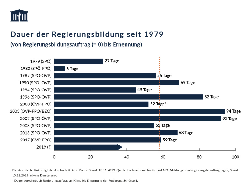 Das B-VG legt keinen verpflichtenden Zeitpunkt fest, bis zu dem eine neue Regierung feststehen muss. In der nachfolgenden Grafik "Dauer der Regierungsbildung seit 1979" lässt sich die durchschnittliche Dauer der Regierungsbildung vom Tag der Nationalratswahl bis zur Ernennung der neuen Bundesregierung ablesen. Seit 1979 betrug diese durchschnittlich 79 Tage.