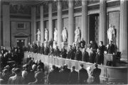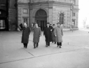 Koalitionsverhandlungen: ÖVP- und SPÖ-Verhandlungsführer nach Besuch beim Bundespräsidenten auf dem Ballhausplatz, 27. Feburar 1953