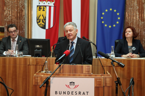 Dr. Josef Pühringer- Landeshauptmann von OÖ am Rednerpult. Im Hintergrund v.li. Josef Saller - Schriftführer und Bundesratsdirektorin Dr.in Susanne Bachmann
