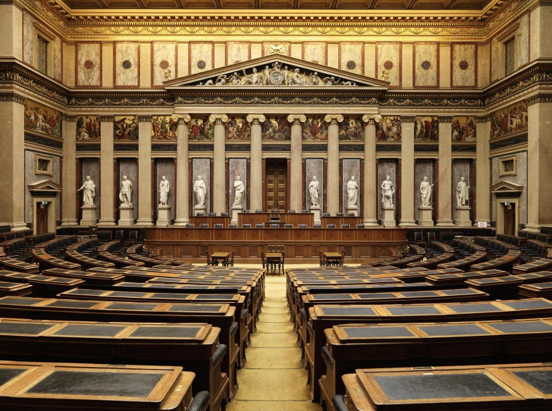 Historischer Sitzungssaal mit Blick Richtung Präsidium.