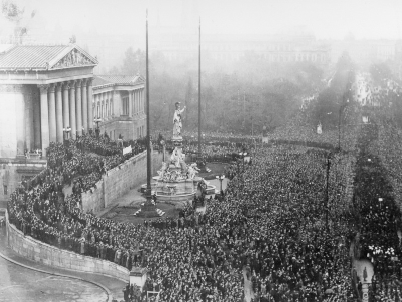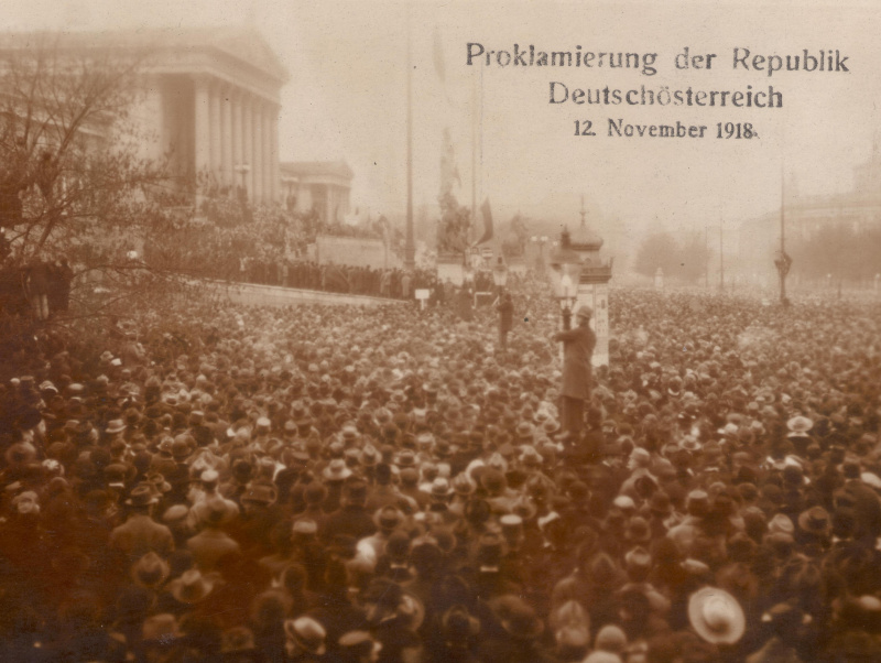 1918 enden der Krieg und die Monarchie. Das Volk fordert Demokratie. Die neue Republik führt das Frauenwahlrecht ein, setzt Sozialreformen durch und gibt sich eine Verfassung.