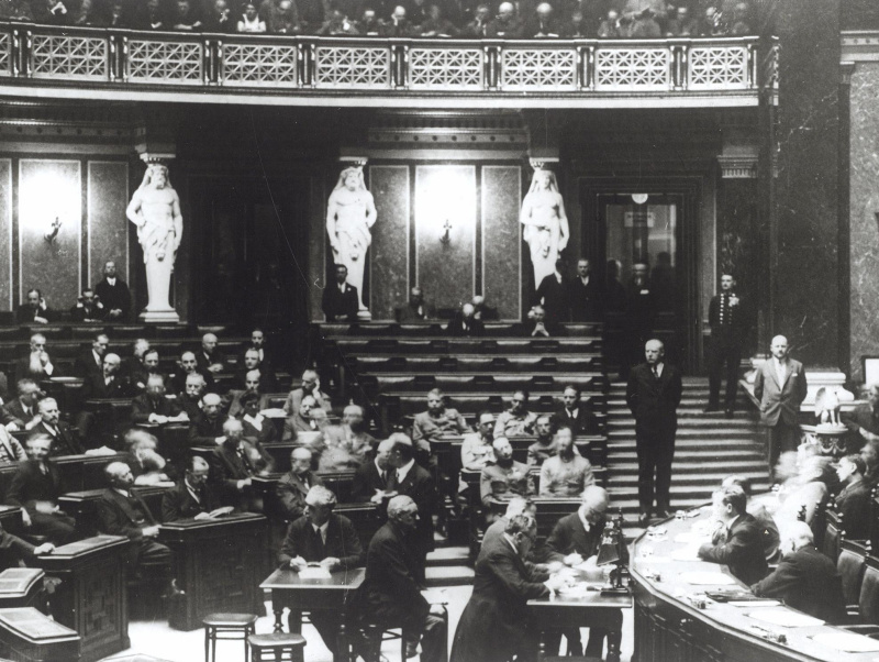 Übrig bleibt ein "Rumpfnationalrat" ohne die Abgeordneten der sozialdemokratischen Opposition. Ihre Mandate erklärt die Regierung per Notverordnung für erloschen.